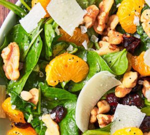 Create a base with mixed baby spinach and rocket leaves. Top with mandarin wedges, toasted walnuts, and dried cranberries.  In a medium bowl, whisk together red wine vinegar, orange juice, honey, poppy seeds, and Dijon mustard. Gradually pour in the olive oil while whisking to emulsify the dressing.